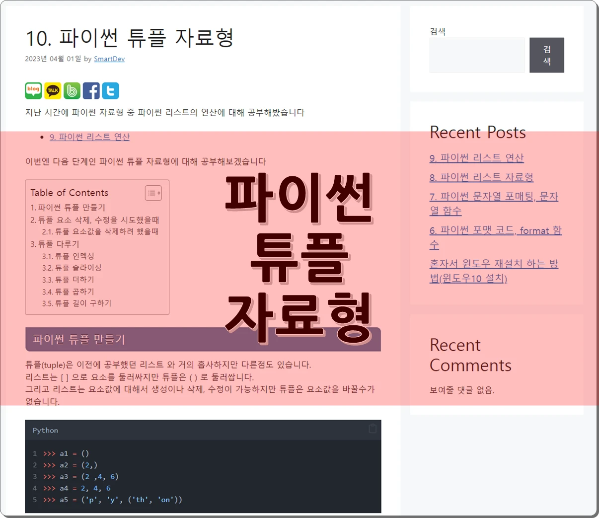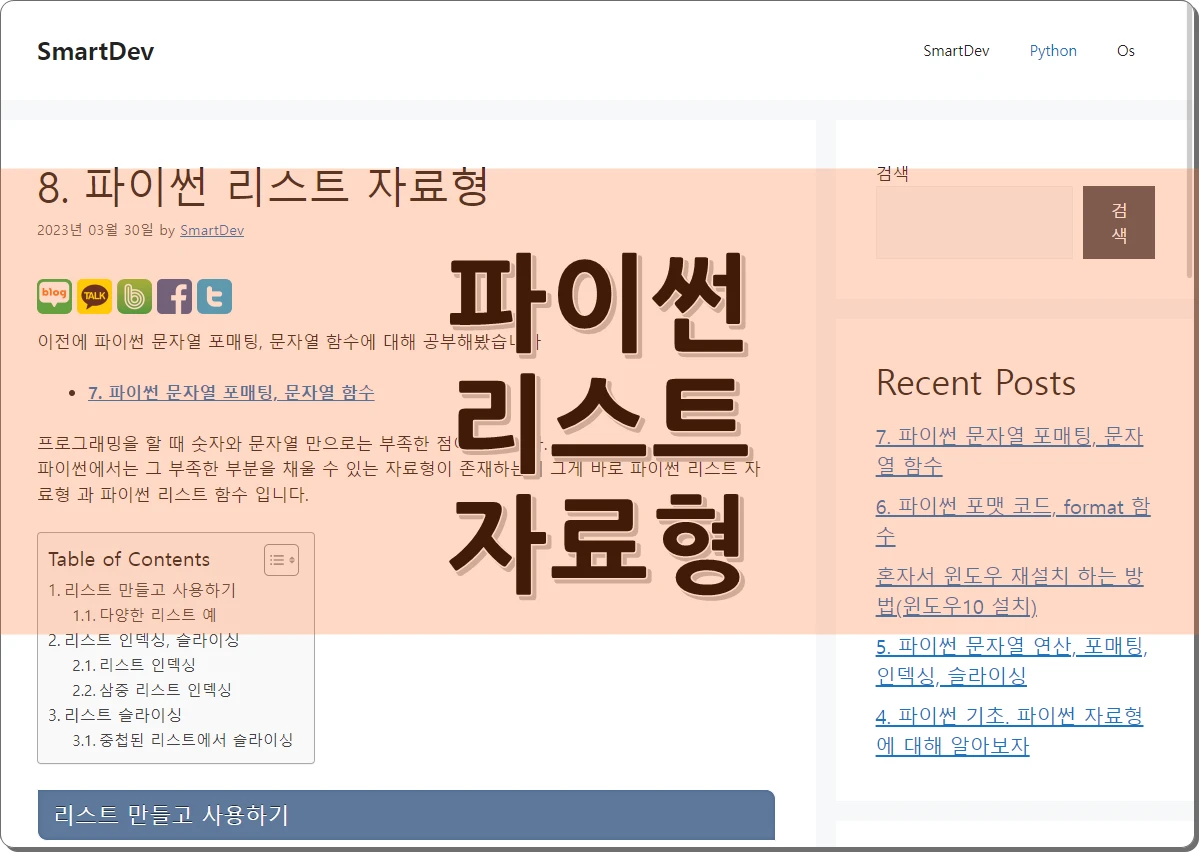 8. 파이썬 리스트 자료형 2026년 03월 22일2023년 03월 30일 이전에 파이썬 문자열 포매팅, 문자열 함수에 대해 공부해봤습니다 프로그래밍을 할 때 숫자와 문자열 만으로는 부족한 점이 많습니다.파이썬에서는 그 부족한 부분을 … Read more