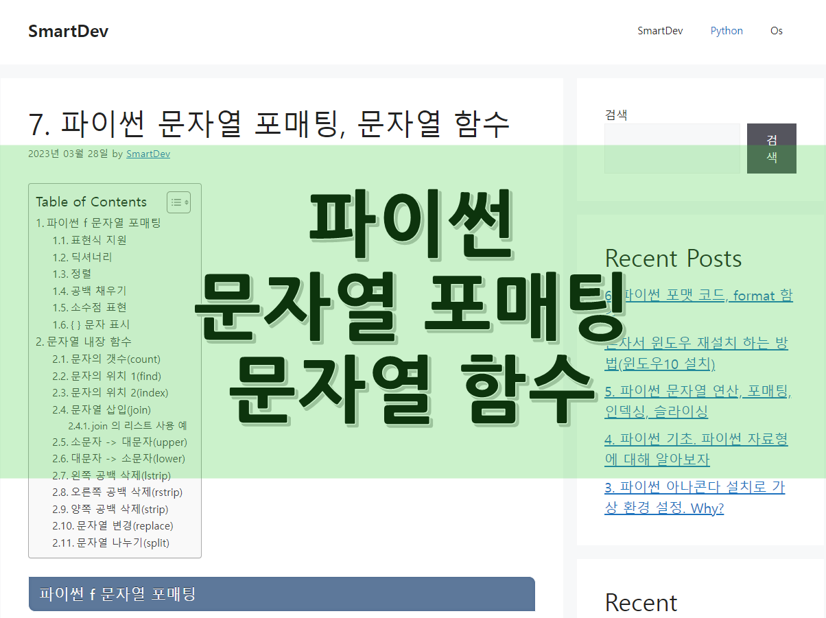 7. 파이썬 문자열 포매팅, 문자열 함수 2026년 03월 22일2023년 03월 29일 파이썬 f 문자열 포매팅 지난번 format 함수에 대해 알아봤는데 이어서 오늘은 파이썬 문자열 포매팅 과 문자열 함수 에 대해 알아보겠습니다.파이썬 … Read more