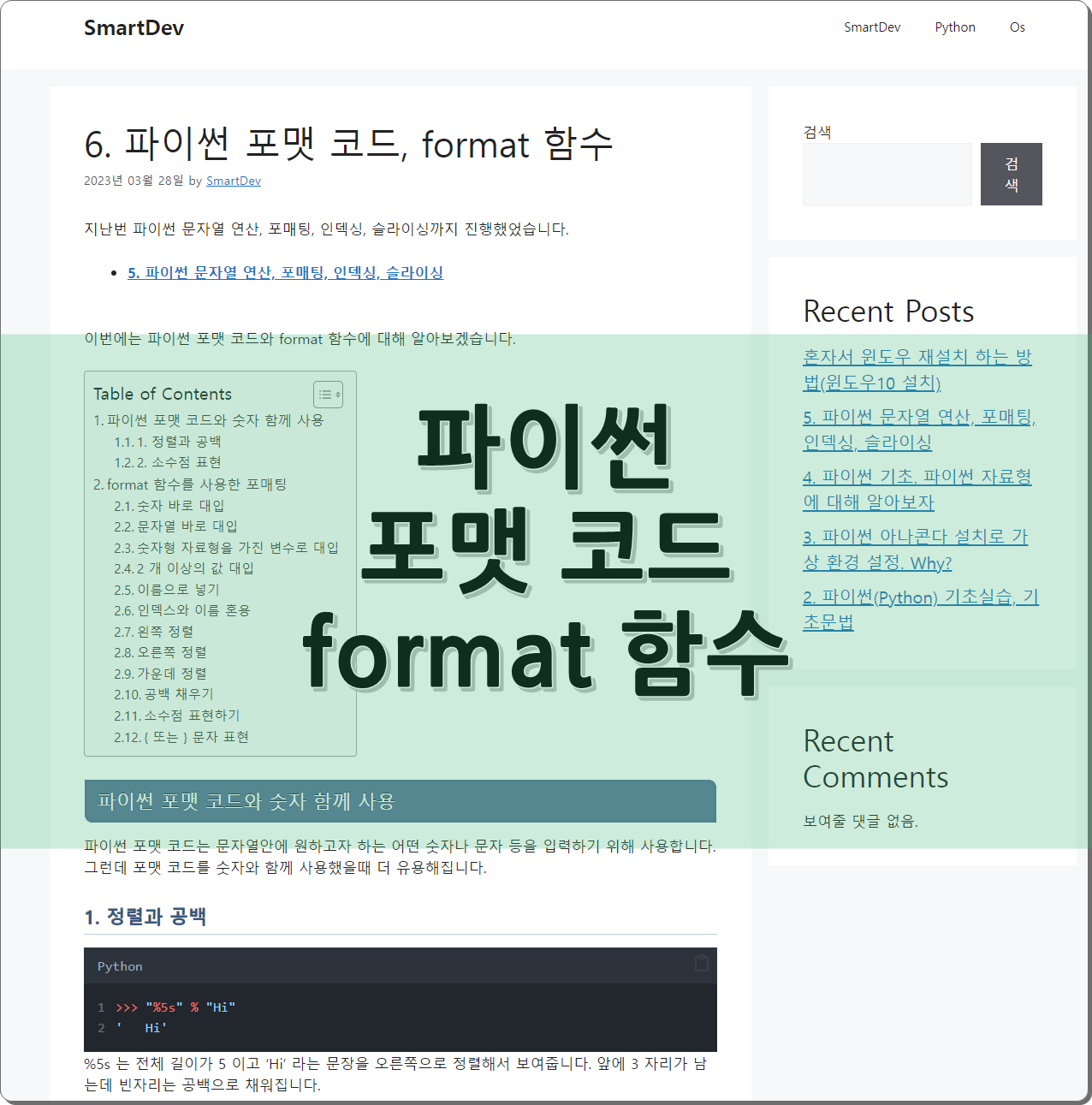 6. 파이썬 포맷 코드, format 함수 2026년 03월 22일2023년 03월 28일 지난번 파이썬 문자열 연산, 포매팅, 인덱싱, 슬라이싱까지 진행했었습니다. 이번에는 파이썬 포맷 코드와 format 함수에 대해 알아보겠습니다. 파이썬 포맷 코드와 숫자 … Read more